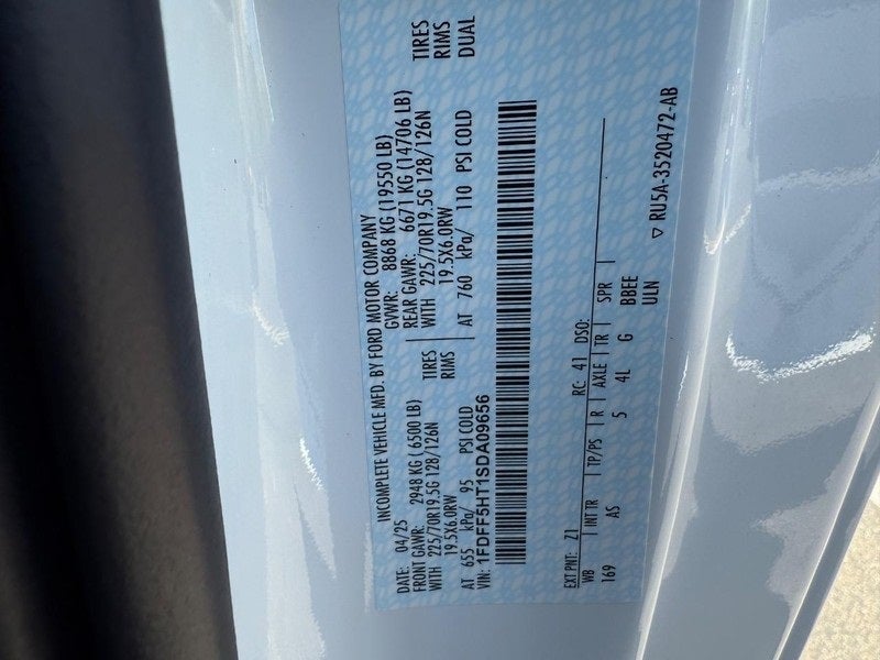 - This 2025 Ford F-550 XL 4x4 Chassis Cab is engineered for demanding job sites and upfit flexibility. It features the 6.7L Power Stroke V8 Turbo Diesel engine paired with a 10-speed TorqShift automatic transmission. Built on a 169-inch wheelbase with a 19,500 lb GVWR, this chassis delivers strength and reliability for flatbeds, service bodies, or vocational upfits. Equipped with a 4.30 limited-slip rear axle, High Capacity Trailer Tow Package, trailer brake controller, and a 40-gallon aft-of-axle fuel tank, this truck is built to handle heavy loads and long days. The Payload Plus Package Upgrade 2 and 410-amp dual alternators provide additional support for equipment and electrical systems. Finished in Oxford White, it includes the XL Chrome Package with fog lamps and platform running boards. Roof clearance lights, heated power mirrors with turn signals, and trailer sway control complete the exterior setup for safety and visibility. Inside, the Medium Dark Slate vinyl interior includes manual A/C, SYNC 4 with an 8-inch touchscreen, FordPass Connect 5G Wi-Fi, remote start, keyless entry, upfitter switches, and a 120V/400W power outlet. A 4.2-inch productivity screen, tilt/telescoping wheel with cruise and audio controls, and power windows and locks add ease and convenience. Safety systems include dual front airbags, Safety Canopy side-curtain airbags, AdvanceTrac with Roll Stability Control, SOS Post-Crash Alert, Securilock anti-theft, and belt-minder chime. The truck is 50-state emissions compliant and factory-built for durability and upfit integration. Backed by Fords commercial-grade warranty: 3-year/36,000-mile bumper-to-bumper, 5-year/60,000-mile powertrain and roadside assist, and 5-year/100,000-mile diesel engine coverage. Available now at Griffin Ford Fort Atkinson ready for your upfit, built to take on the job.