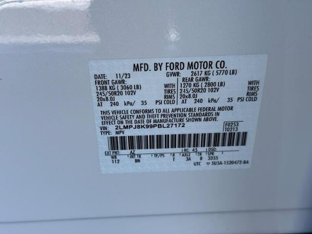 10 Speakers, 3.80 Axle Ratio, 360 Degree Camera, 4-Wheel Disc Brakes, ABS brakes, Active Park Assist 2.0, Adaptive Cruise Control, Air Conditioning, Alexa Built-In, AM/FM radio: SiriusXM with 360L, Auto High-beam Headlights, Auto tilt-away steering wheel, Auto-dimming door mirrors, Auto-dimming Rear-View mirror, Automatic temperature control, Brake assist, Bumpers: body-color, Compass, Delay-off headlights, Distance Indication & Alert, Driver door bin, Driver vanity mirror, Dual front impact airbags, Dual front side impact airbags, Electronic Stability Control, Emergency communication system: 911 Assist, Equipment Group 201A, Evasive Steering Assist, Forward-Side-Rear Parking Sensors, Four wheel independent suspension, Front anti-roll bar, Front Bucket Seats, Front Center Armrest w/Storage, Front dual zone A/C, Front reading lights, Fully automatic headlights, Garage door transmitter: HomeLink, Heated door mirrors, Heated front seats, Heated rear seats, Heated steering wheel, Illuminated entry, Knee airbag, Leather steering wheel, Lincoln Co-Pilot360 1.0 Plus Package, Low tire pressure warning, Memory seat, Occupant sensing airbag, Outside temperature display, Overhead airbag, Overhead console, Panic alarm, Passenger door bin, Passenger vanity mirror, Phone As A Key, Power door mirrors, Power driver seat, Power Liftgate, Power moonroof: Panoramic Vista Roof, Power passenger seat, Power steering, Power windows, Premium Lthr-Trmmd Heated/Ventilated Comfort Seats, Radio data system, Radio: AM/FM/HD Audio System, Rain sensing wipers, Rear anti-roll bar, Rear reading lights, Rear seat center armrest, Rear window defroster, Rear window wiper, Remote keyless entry, Satin Roof Rack Side Rails w/o Crossbars, Security system, Speed-sensing steering, Speed-Sensitive Wipers, Split folding rear seat, Spoiler, Steering wheel memory, Steering wheel mounted A/C controls, Steering wheel mounted audio controls, SYNC 4 w/Enhanced Voice Recognition, Tachometer, Telescoping steering wheel, Tilt steering wheel, Traction control, Trip computer, Turn signal indicator mirrors, Variably intermittent wipers, Ventilated front seats, Wheels: 20 Prem Painted Bright Machined Aluminum.